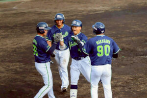 4回裏 鈴木の2点タイムリー二塁打でくふうハヤテ静岡が先制。和辻のタイムリー安打で1点を追加。