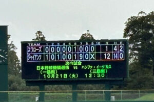 7回裏 浅野のタイムリー安打、J.ティマのタイムリー二塁打、萩尾のタイムリー安打、中田の3点タイムリー三塁打、坂本達のタイムリー安打、J.ティマの2点タイムリー二塁打でこの回一挙9点を奪った巨人が12-1で勝利した。